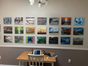 Other times, I’ll be thinking random thoughts when walking the dog or swimming and will get inspired to paint something based on the skyline, a tree, a color for a feeling.